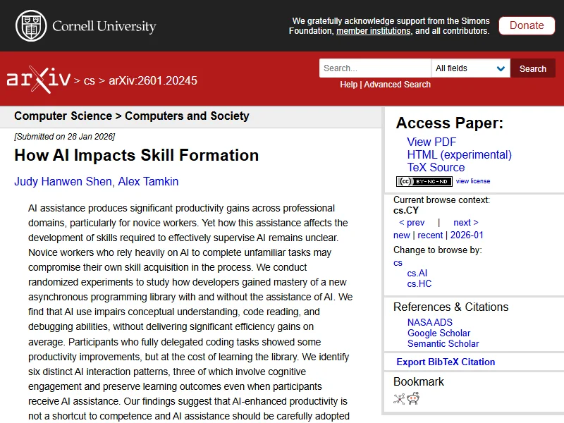 - How AI Impacts Skill Formation (arXiv:2601.20245)