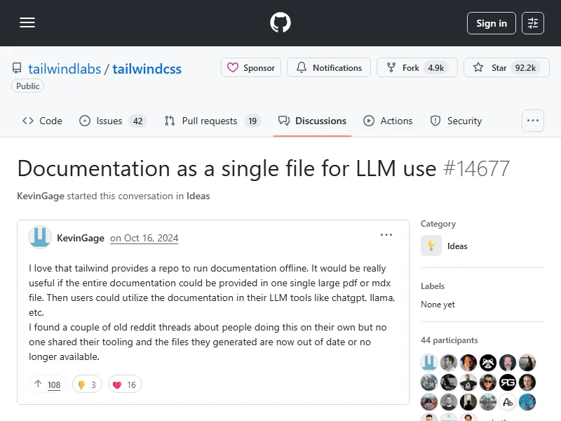 - Tailwind Labs GitHub Discussion - Documentation as a single file for LLM use