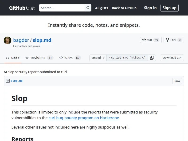 - AI slop security reports submitted to curl | GitHub Gist