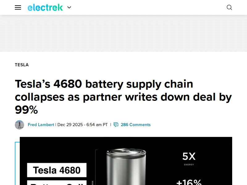 - Tesla's 4680 battery supply chain collapses as partner writes down deal by 99% | Electrek