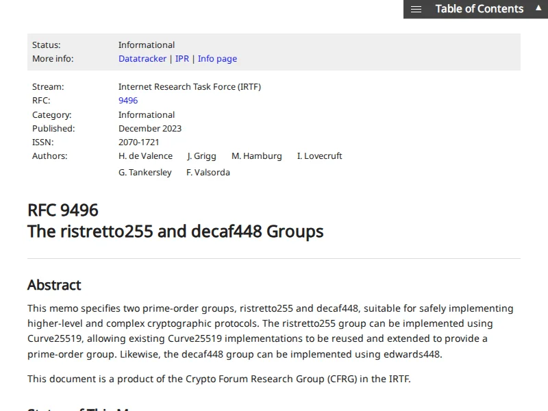 - RFC 9496: The ristretto255 and decaf448 Groups