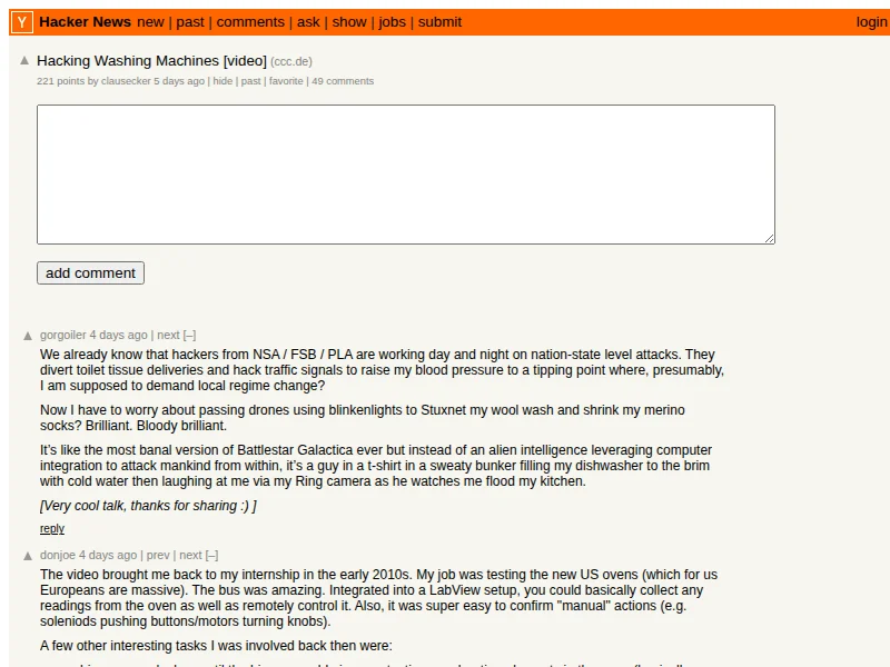 - Hacker News: Hacking Washing Machines