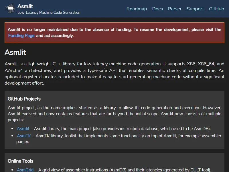 - AsmJit: Low-latency machine code generation