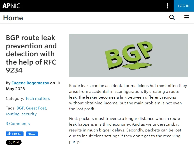 - APNIC Blog: RFC 9234 BGP Route Leak prevention