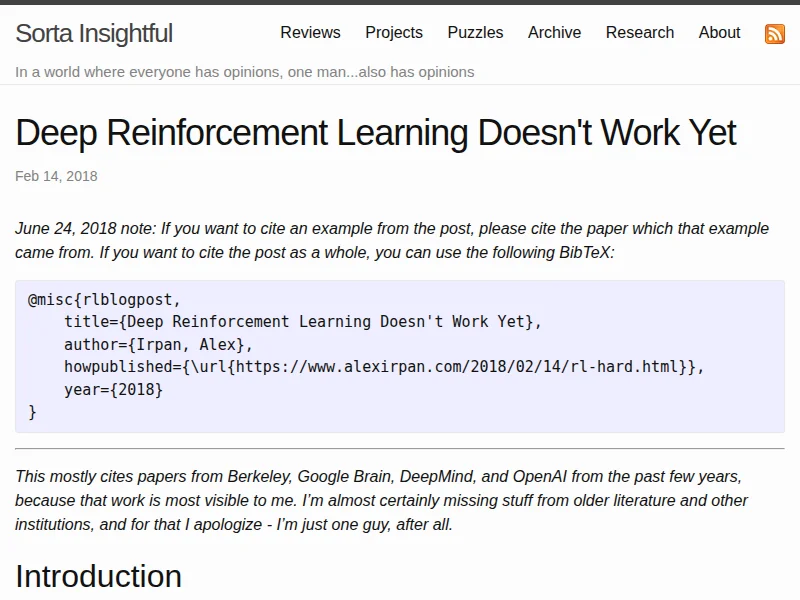 - Deep Reinforcement Learning Doesn't Work Yet