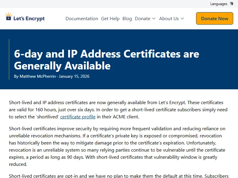 - 6-Day and IP Address Certificates are Generally Available - Let's Encrypt