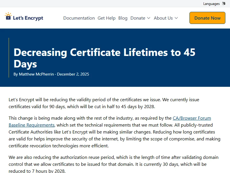 - Decreasing Certificate Lifetimes to 45 Days - Let's Encrypt