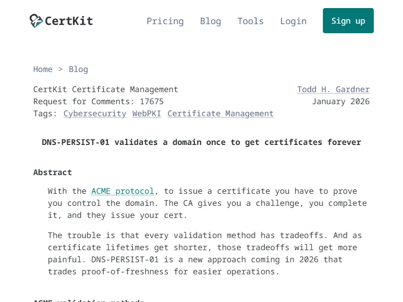 - DNS-PERSIST-01 validates a domain once to get certificates forever