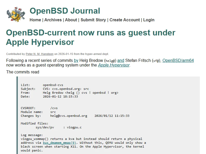 - OpenBSD-current now runs as guest under Apple Hypervisor